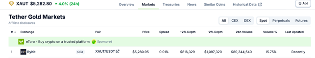 Bybit, вторая по торговому объему криптовалютная биржа в мире, объявила, что стала централизованной биржей №1 по спотовой торговле Tether Gold (XAUT). Согласно данным CoinGecko, на нее приходится примерно 15,75% общего торгового объема XAUT на централизованных площадках.