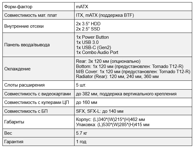 Модель T20, выполненная в формате mATX, предусматривает установку материнской платы под углом 90°, что благоприятно влияет на эффективность охлаждения. В корпус предустановлены пара 120-мм вентиляторов Tornado T12-R. Новинка способна вместить до 5 120-мм вентиляторов, а также радиаторы размером до 360 мм. Корпус совместим с блоками питания типа SFX и SFX-L.