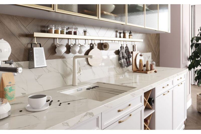 Обладающий наивысшими показателями по функциональности, практичности и красоте среди всех видов натуральных и искусственных материалов, кварцевый агломерат абсолютно идеальный материал для кухонной мебели благодаря таким характеристикам, как устойчивость к влаге, температурным воздействиям и механическим повреждениям.