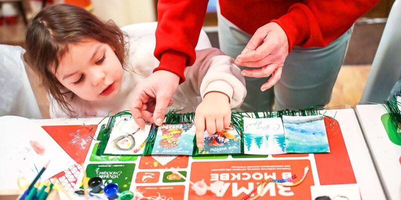 В сквере по Олонецкому проезду юные москвичи и гости столицы под руководством педагогов расписывают керамические и деревянные елочные игрушки в виде конфеты, часов, колокольчиков, карусели и котенка по имени Гав из серии советских мультфильмов. На занятиях дети учатся рисовать узоры, вдохновленные новогодними мотивами, сказкой «Морозко» или московской архитектурой. Современные технологии и новогодние блюда