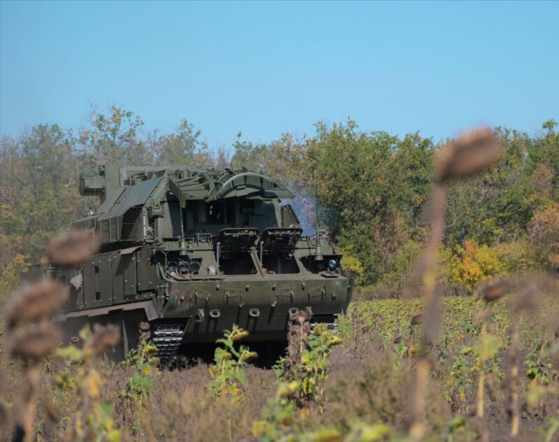 «По стоящей технике – легче прилететь, так как дрон знает, куда идти, а когда техника маневрирует, соответственно, дрон не знает, куда ему двигаться», — рассуждает в разговоре с журналистами Минобороны начальник расчета ЗРК «Тор-М2», воюющего в составе группировки войск «Центр» на Красноармейском направлении.