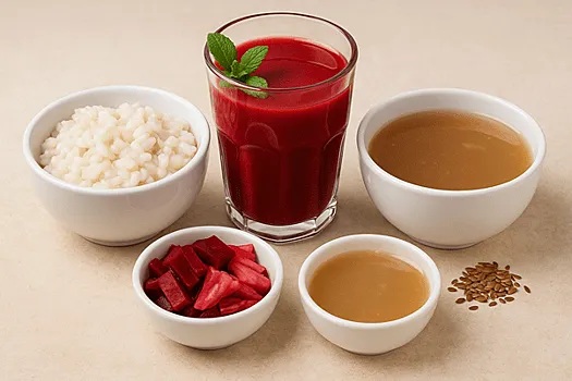 Состав (пример):  свекольный сок, сок квашеной капусты, настой мяты, ложка льняного масла. Употребляется натощак в тёплом виде.