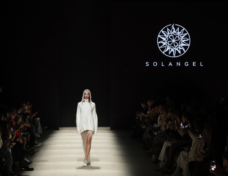 Ирена Сопрано — дизайнер Solangel — вдохновилась морозным солнечным утром и перенесла эту атмосферу в новую коллекцию. Показ открывала блогер Мариям Тилляева. Звезда вышла в белоснежном трикотажном костюме, усыпанном жемчужинами, которые напоминали снежинки. Также в линейке фигурировали и другие трикотажные изделия: микрошорты, жилеты с мехом, уютные свитера, анораки, кардиганы и платья. Все они декорированы сияющими элементами, ассоциирующимися с мерцанием снега на солнце. Закрывала показ юная знаменитость — Аврора Киба, которая вышла на подиум в роскошном свадебном платье.